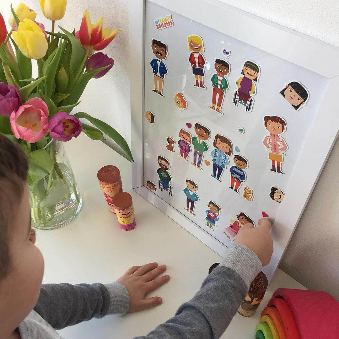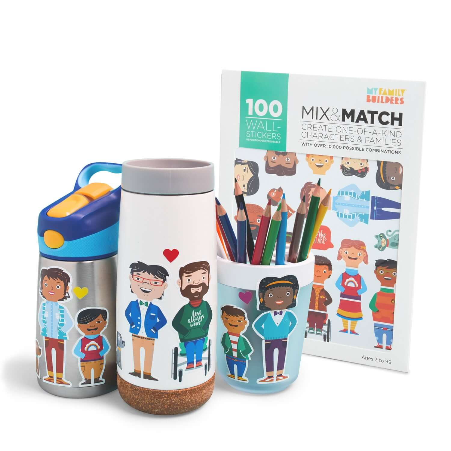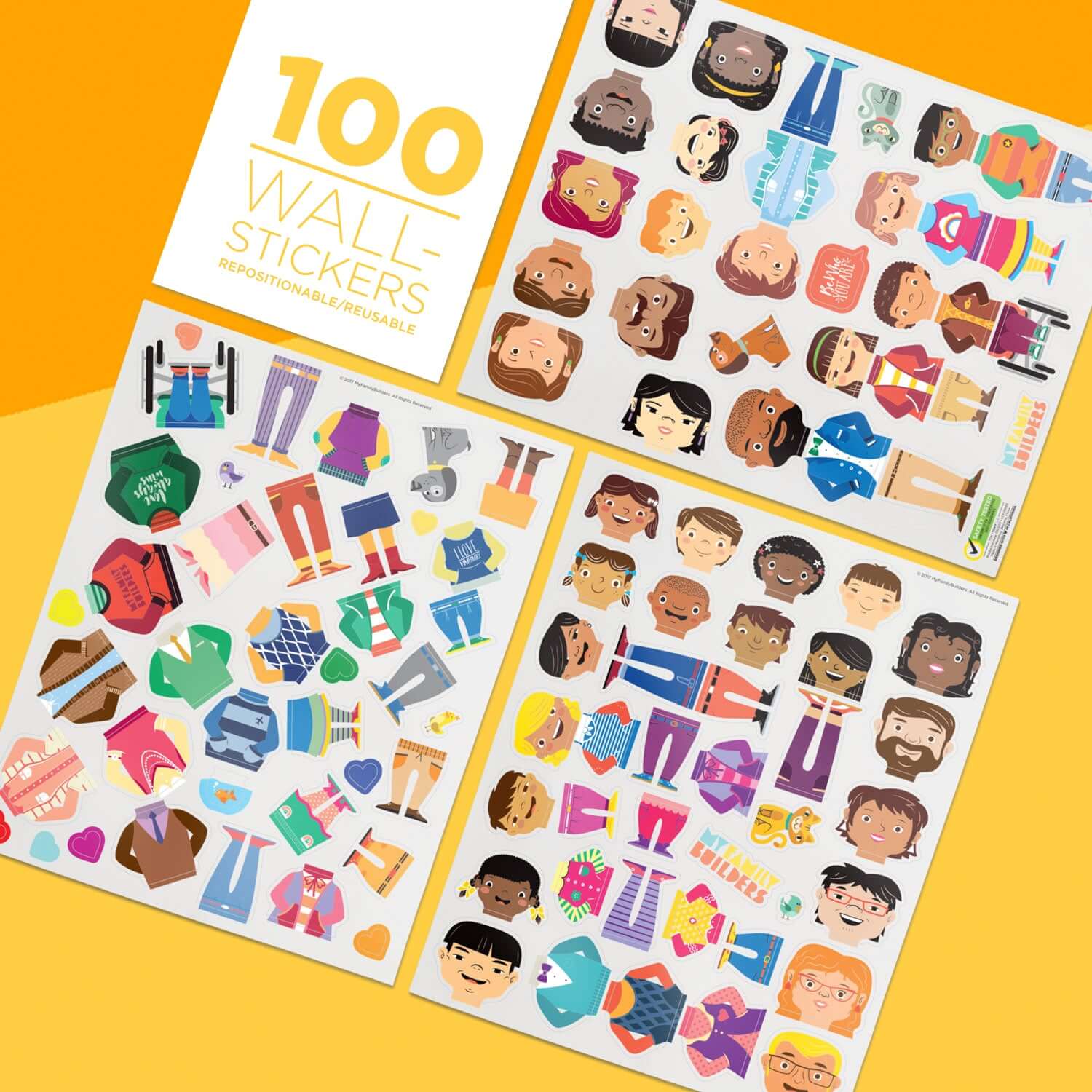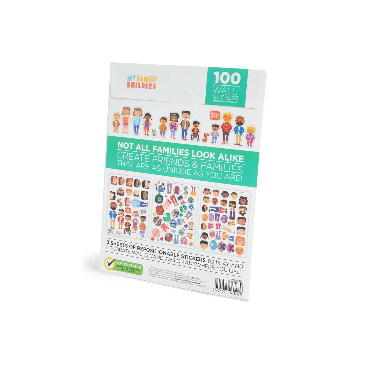 Includes: 100 Wall repositionable stickers: 16 adults heads, 18 kids heads, 12 big bodies, 14 small bodies, 11 big legs, 14 small legs, 1 big wheelchair, 1 small wheelchair; 3 stickers (head, body, and legs) make up a character. 8 pets, 8 hearts and 1 text bubble "Be who you are". Family Diversity Blocks.